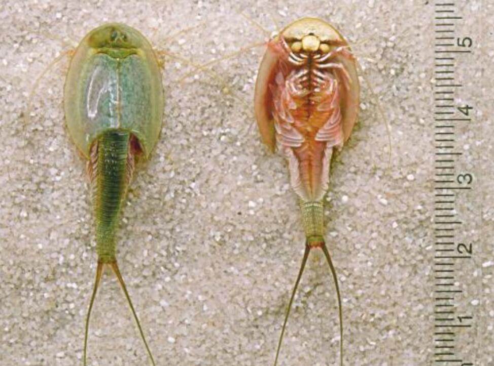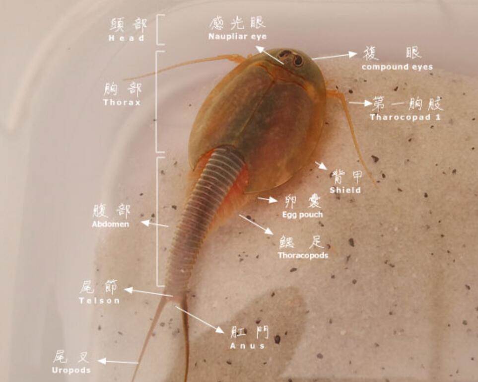 從這家伙的外形來看,有著發達的盾形頭胸甲和長長的體節以及尾巴。雄性的體節要比雌性的多,不過它們有的是雌雄異體,有的則是雌雄同體,可以進行自體受精,最終發育成雌性。